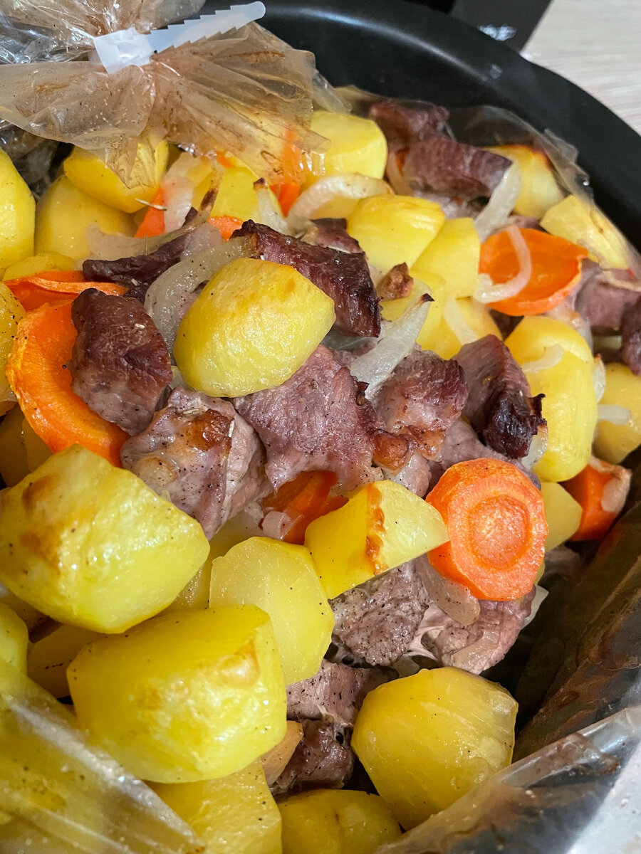 Друзья! Сегодня приготовим свинину с картошкой в рукаве в духовке. Этим блюдом можно накормить сразу всю семью! Овощи отлично пропитываются ароматами и вкусами мяса, готовясь в герметичной упаковке! Рецепт можно дополнить грибами и другими любимыми овощами. Я очень люблю готовить блюда в рукаве, сочно, ароматно и не занимает много времени! А также готовится сразу гарнир и мясо! Не приходится пачкать много посуды и стоять у плиты, нарезал все ингредиенты, сложил их в рукав для запекания, поставил в духовку и вот тебе отличный ароматный ужин! Для приготовления нам понадобятся следующие ингредиенты: Итак, приступим к приготовлению Шаг 1. Подготовим все необходимые ингредиенты. Картофель очистим от кожуры и хорошо помоем от загрязнений. Очищенный картофель нарезаем крупными кусочками Шаг 2. Свинину лучше брать с небольшими прослойками жира, чтобы блюдо получилось сочным и нежным. Нарезаем мясо небольшими кусочками Шаг 3. Лук и морковь очищаем и промываем под холодной проточной водой