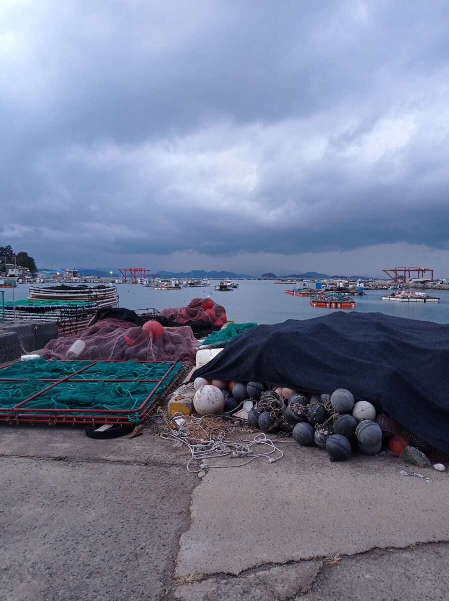 На следующее утро меня повезли в местный магазин одежды, где помимо повседневно-прогулочного рациона была рабочая форма. Мне приобрели резиновый комбинезон, резиновые сапоги самого большого размера что были (с этим у меня беда, мой размер ноги 46 российский. В Корее максимальный стандартный - 44), а так же камуфляжный комплект одежды. После покупок мы отправились прямиком в порт, где я переоделся и мы вышли в море. Фоток самой работы я не делал, я в принципе не люблю фотать + боязнь утопить телефон. Мне показали фронт работы и количество ячеек фермы. Мне показалось, что ферма большая и вряд ли я осилю, но ничего - справился. Кстати, в первый же день я улетел за борт.) Сапоги быстро набрали воду и настойчиво потянули меня ко дну, но я всегда любил бассейн и плавание, да и хорошие люди не тонут. После этого меня быстро повезли переодеваться и сообщили что я - молодец, большинство отказывается от работы после таких происшествий.