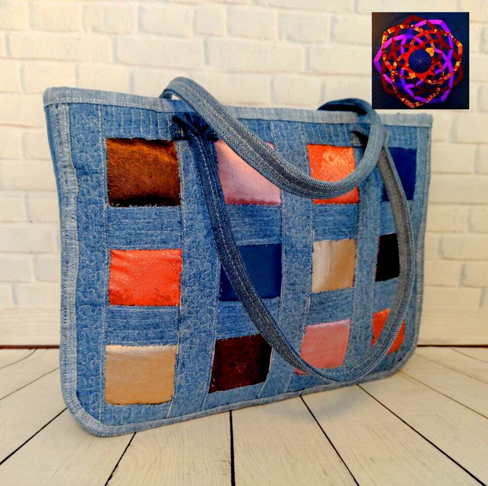 И так как я купила кусочек джинсовой ткани с блеском (уж очень красиво она смотрится в виде окантовки), то видать еще пара сумочек меня ждёт. Тем более что эту, новую, сразу «подарила» себе дочка. Она идеально подошла к её новым джинсикам и футболочке. А я увидела, что цветные квадратики с успехом подстраиваются под любой цвет одежды. Именно это я и хотела получить – сумку, подходящую под всё!