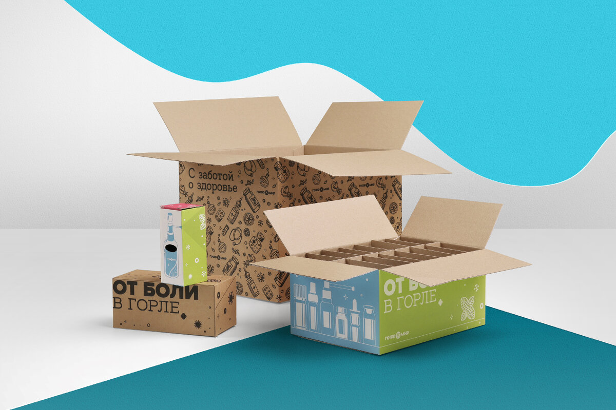 Как упаковать лекарства, чтобы они не повредились при транспортировке? Самая надежная тара – это упаковка из гофрокартона. Гофроупаковка также с легкостью станет дополнительным маркетинговым инструментом, если нанести на неё красивый дизайн. Рассказываем про варианты упаковки и возможности печати далее. Монохромный стиль Дизайн упаковки может быть выполнен из множества графических элементов в монохромной цветовой гамме. Здесь, например, подойдут элегантные силуэты вашей продукции или паттерн в стилистике бренда. Такие дизайны мы наносили на наши работы для лекарственных средств. Адаптировали визуальные решения под стандартные модели коробок. Для перевозки лекарственной продукции в индивидуальной упаковке предназначена стандартная 4-х клапанная коробка. Она является дополнительным барьером от внешнего воздействия на продукцию внутри. Здесь был напечатан множественный паттерн из медикаментов. Под бутылочки с лекарственными средствами часто используют коробку с крышкой и надежной системой