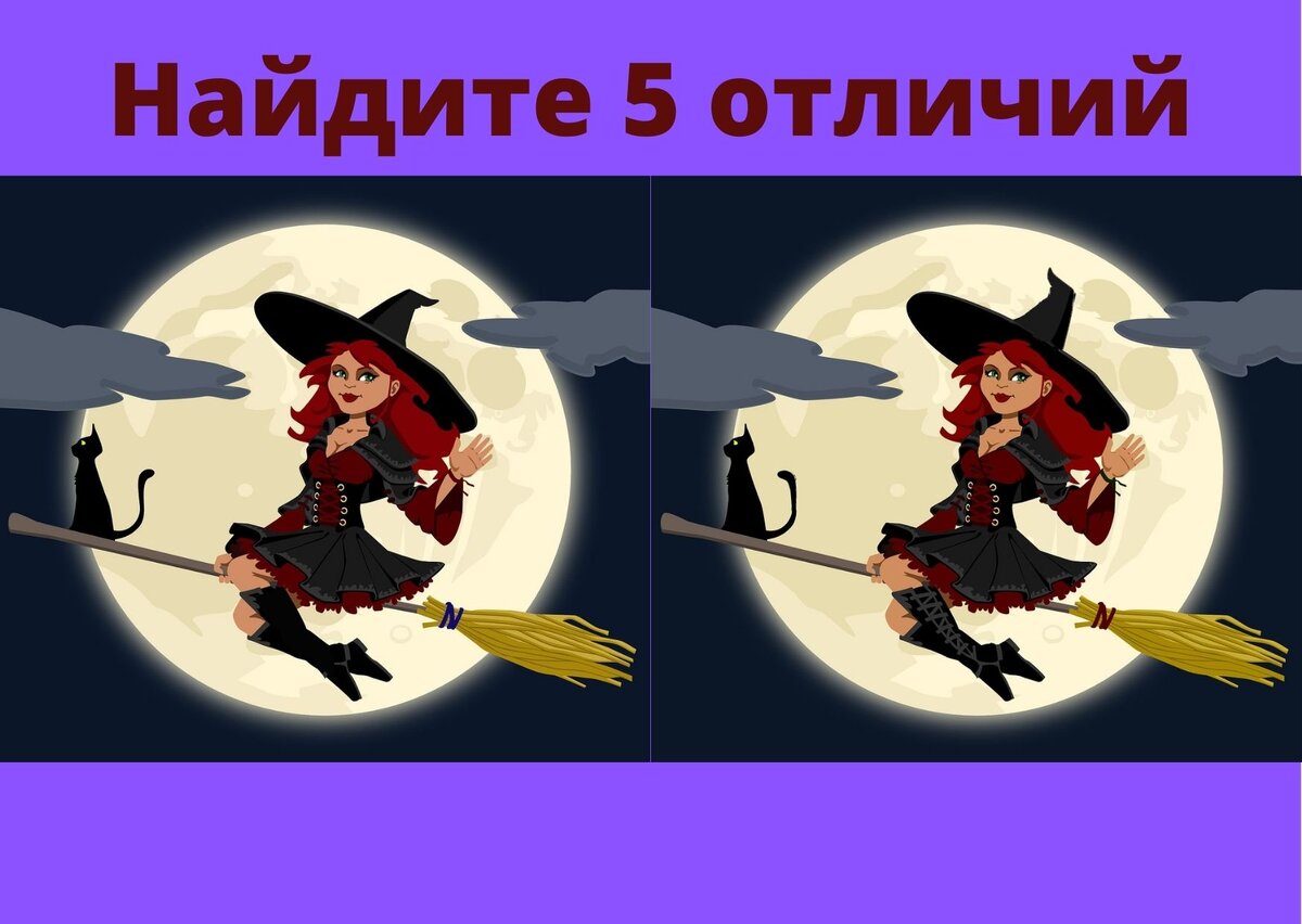 И снова здравствуйте!!! В сегодняшней публикации продолжаем недавно начатую тему, а именно - игру на внимательность "Найди отличия". Правила просты - определить на двух (казалось бы, одинаковых с виду) картинках мелкие не совпадающие элементы. Итак, попробуйте отыскать пять отличий за одну минуту: Не забывайте, пожалуйста, писать в комментариях какие же отличия на картинках с изображением рыжеволосой барышни на метле Вы нашли. Также лайки и подписки только приветствуются! До скорых встреч!!!