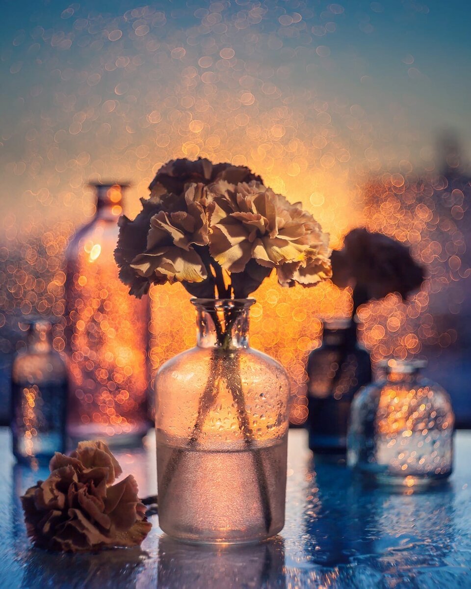 Данный кадр был сделан на Trioplan 2,9/50. Я очень люблю контровый свет, а окна у меня выходят на закат. В качестве фона здесь служило окно, на которое я разбрызгала воду из пульвелизатора. А дальше закатное солнце сделало свое дело. Для подсветки цветов на переднем плане я использовала фотофонарь, который располагался справа от камеры (фото 1, на фото 2 он за камерой). Можно было также использовать отражатель. У этой фотографии есть один минус - цветок (отмечен) здесь лишний, он слишком темный. Он отвлекает. Его нужно было бы либо убрать, либо