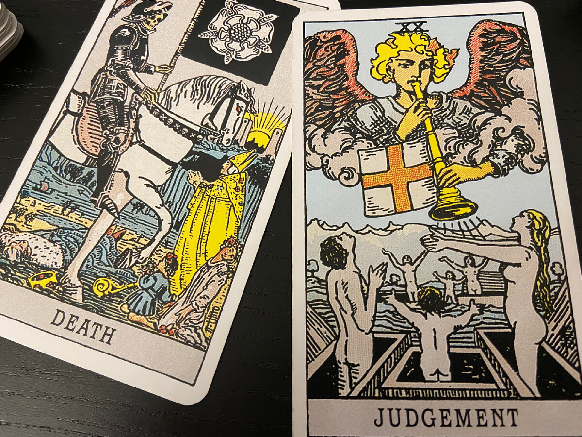 Все мы знаем стандартный порядок Старших Арканов. Он изображает путь героя, когда с нуля персонаж развивается и проходит разные ситуации. Что новое я понял? Обратите внимание на 13 карту - Смерть. А что, если смерть (ну не для нас, а персонажа таро) настоящая, а не «метафизическая» гибель старых идеалов?? На карте Суд, мы видим воскрешение. А с чего бы воскрешать, если человек лишь метафизически умирал? Вот вот. Что это даёт? Да я сам не знаю)) Но получается так, что карты с 14 по 19 происходят не в нашем мире, а загробном/духовном/астрале - как угодно. В греческой мифологии, когда Одиссей спускался в подземное царство, его встречал проводник душ, а затем проверял цербер. Возможно умеренность - это ангел(дух) проводник, дьявол - это цербер, далее идут ступени спуска вниз, может быть это башня. Также с потусторонним миром связаны животные, а конкретно лошади и собаки. Собаки на аркане Луна (собака и волк, но волк дикая собака), а лошадь на смерти и солнце. Что интересно - на крайних ар