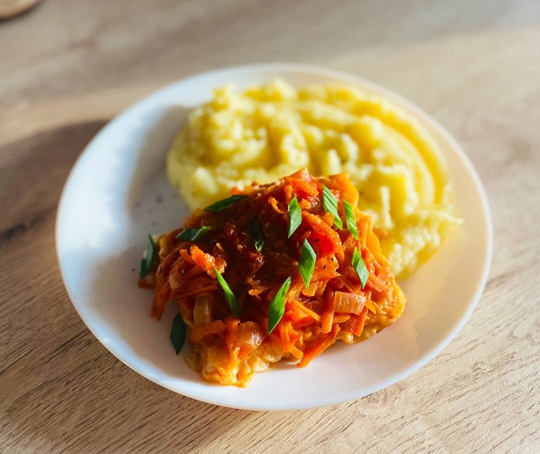 Ингредиенты: Филе трески, Лук, Морковь, Томаты в соку, Мука, Масло растительное, Специи