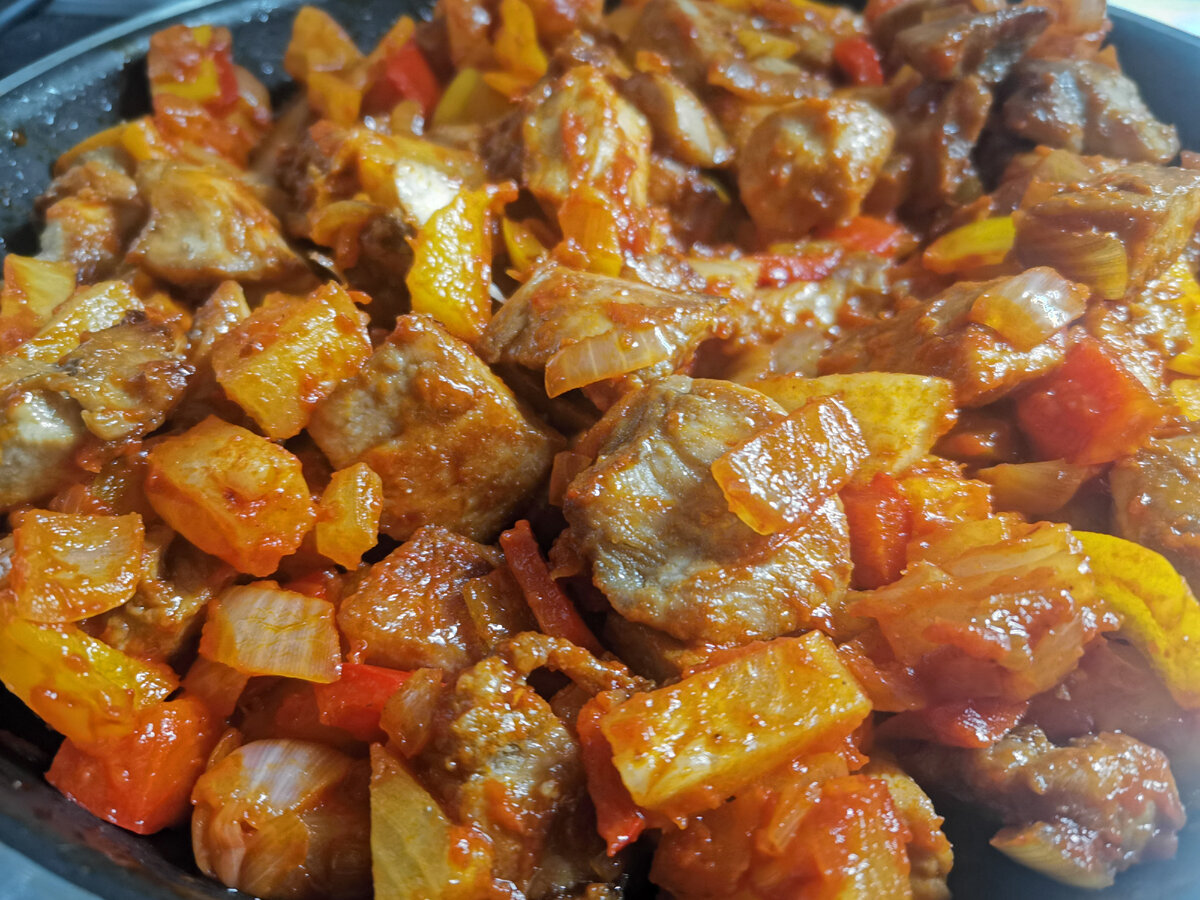 К соусу добавляем мелко нарезанный ананас, добавляем молотый перец и соль.(соль по необходимости) Тщательно перемешиваем и добавляем к курице и тушим еще пару минут и подаем к столу.