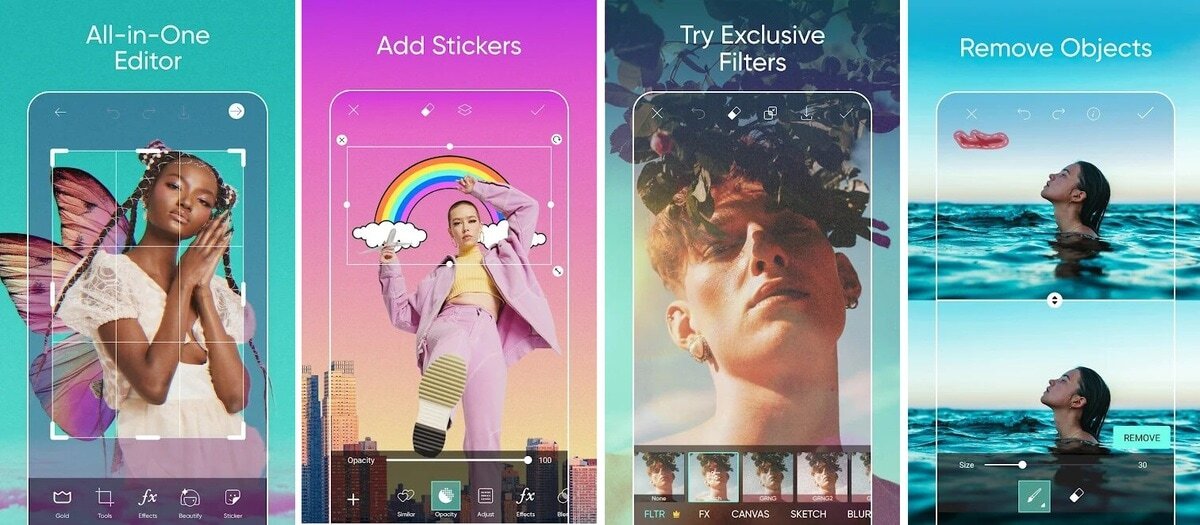 Большинство опций бесплатно. Платить потребуется за смену фона, удаление объектов и большинство функций ретуши. Также можно приобрести дополнительный набор фильтров.