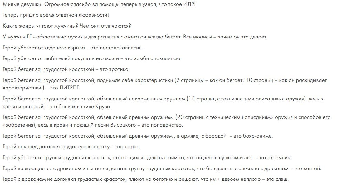 Мой вариант про женщин авторов ЖенЦкое писательство обязательно с героиней девушкой. И она должна в конце влюбиться! Героиня влюбляется в богатого мужика с тачкой (100 страниц сомнений в любви) — это слр (современный любовный роман); Героиня влюбляется в богатого мужика с тачкой в космосе — это космоопера; Героиня влюбляется в дракона (200 страниц сомнений в любви, запирание в замке и истинная любовь) — это ромфант; Героиня влюбляется в дракона, который не может оборачиваться человеком — это хентай; Героиня влюбляется в чувство юмора — это юмористический роман; Героиня влюбляется в призрака — это мистика; Героиня влюбляется в призраки прошлого — это драма; Героиня влюбляется, потому что больше не в кого влюбляться — это постапокалипсис; Героиня влюбляется в того, кто борется с зомби — это зомби апокалипсис; Героиня влюбляется в того, кто в книге автора был ее врагом — это фанфик; Героиня влюбляется, и рядом полиция или стража — это детектив; Героиня влюбляется в того, кто называет свой