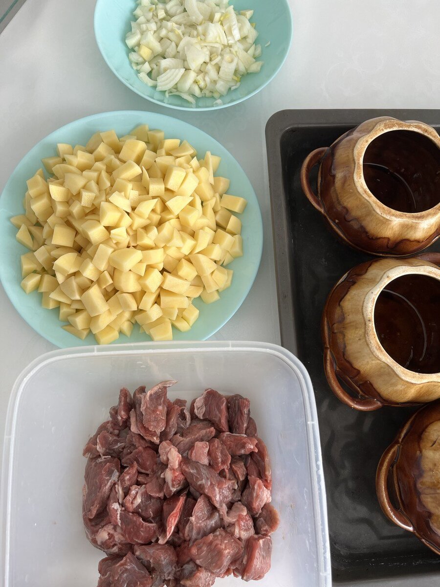 Ингредиенты: Мясо, любое (у меня говядина) - 700 гр. Лук - 6 шт. Картофель - 12 шт. Морковь - на глаз, у меня была уже тертая, замороженная. Соль и специи Приготовление: Шаг 1: Раскладываем мясо. Заранее смешала с солью и черным перцем. Шаг 2: Добавляем лук и морковь. Шаг 3: Добавляем картофель Шаг 4: Заливаем подсоленной водой (можно бульоном). Шаг 5: Накрываем крышками и отправляем в духовку. Готовим 1,5-2 часа при 180°C При подаче можно добавить зелень) Приятного аппетита ❤️