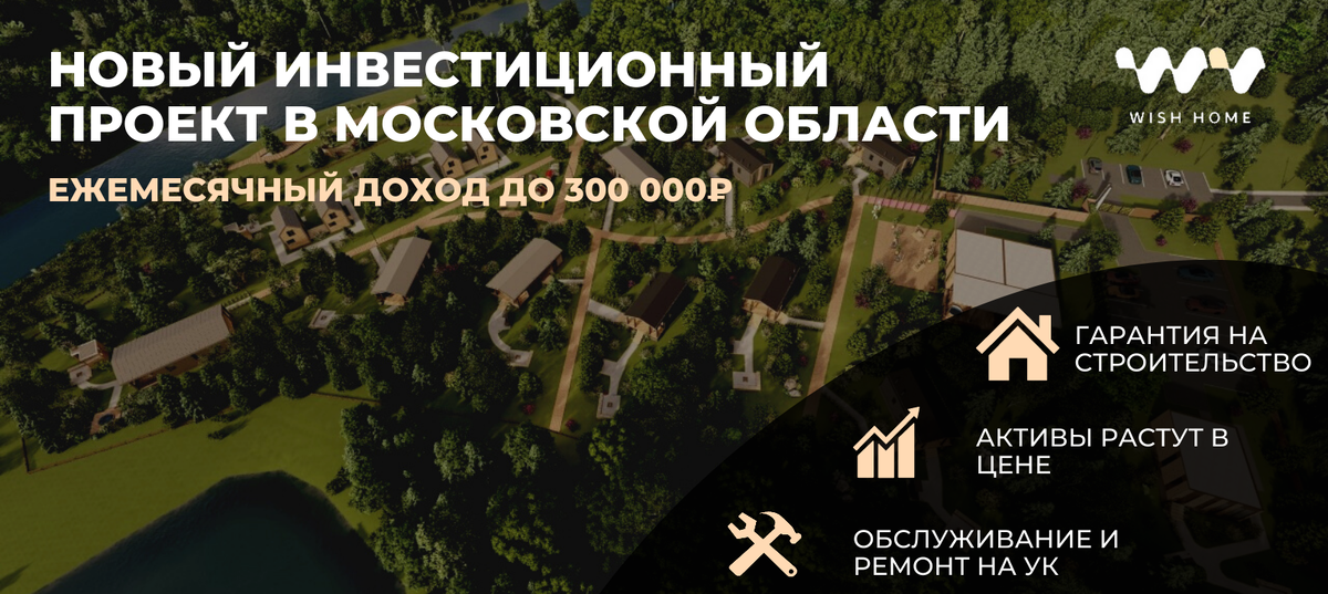 Совершенно новый формат инвестиций в загородную недвижимость с доходом до 20% годовых предлагает проект Wish Home. Это инвестиционный проект формата Holiday Village, в рамках которого инвестор передает принадлежащую ему собственность в доверительное управление профильной отельной Управляющей компании, которая в дальнейшем сдает это имущество в аренду и направляет 60% всех арендных платежей владельцу недвижимости. Компания получает процент от выручки, поэтому вся ее деятельность напрямую направлена на максимизацию извлекаемой прибыли.