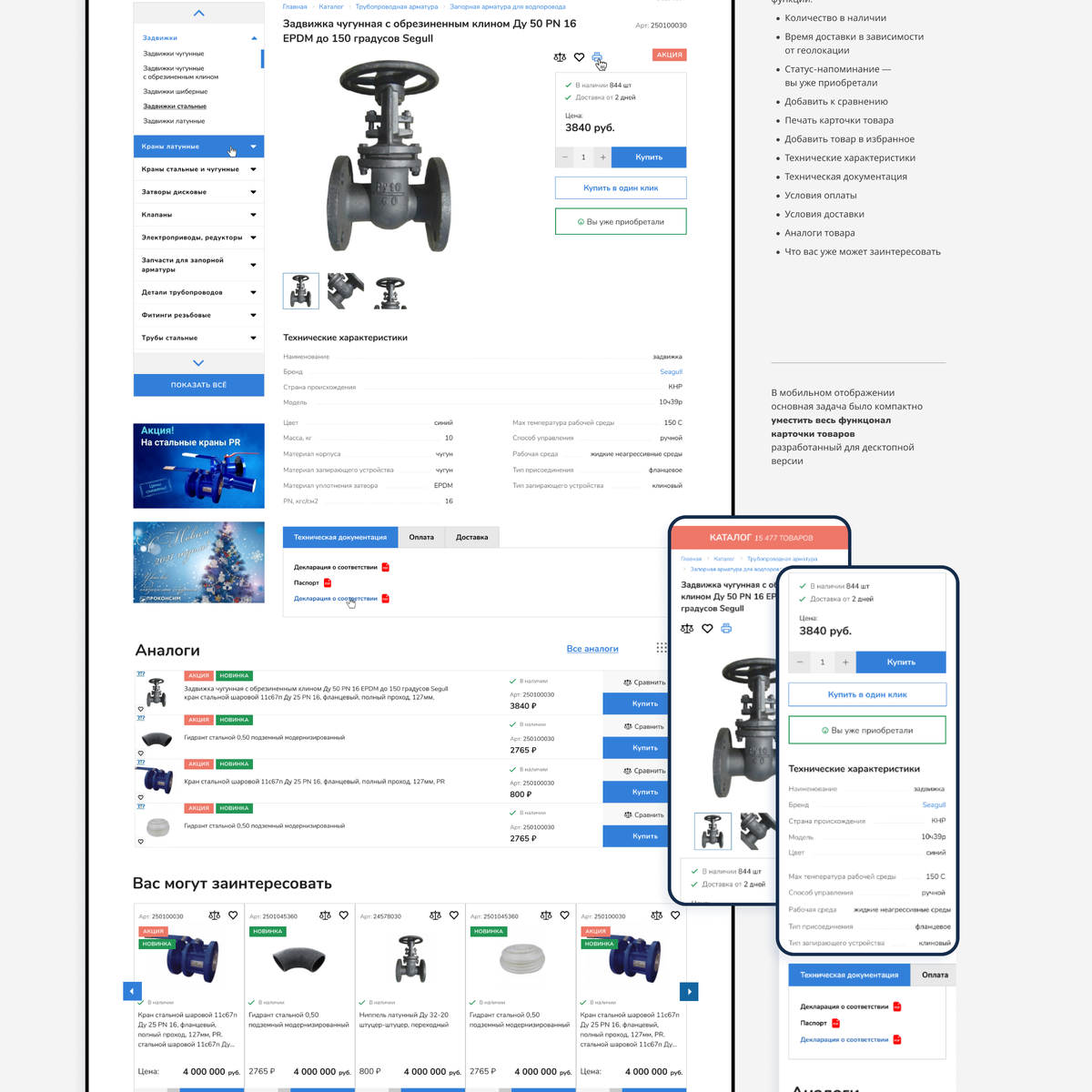 К нам пришел клиент, который занимается розничной и оптовой продажей трубопроводной арматуры и комплектующих. У клиента уже был сайт, однако на нем был ряд проблем: 📌 Устаревший дизайн образца 2007 года; 📌 Ошибки в верстке, "кривые" отступы и элементы; 📌 Очень запутанная структура каталога; 📌 Маленький размер ключевых кнопок, по которым трудно нажать; 📌 Непродуманный и сложный интерфейс сайта усложнял процесс покупки и увеличивал процент отказов на сайте. Первым делом мы проанализировали нишу клиента, детально изучили его магазин и ассортимент, провели анализ ключевых конкурентов и в итоге определили направление для дальнейшей работы: ✅ улучшить опыт взаимодействия пользователей с магазином, и, как следствие, увеличить конверсию; ✅ Выстроить визуальную иерархию, чтобы облегчить поиск информации; ✅ Спроектировать и сделать понятным процесс покупки; ✅ Сделать интерфейс интуитивно понятным для новых покупателей, не усложнив его для постоянных. Помимо этого в каталоге товаров был разр
