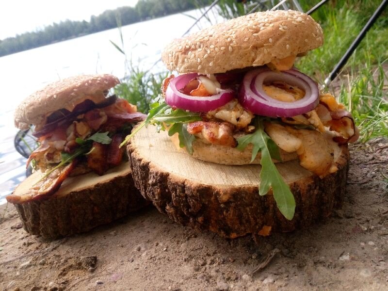 - острый молотый перец Способ приготовления нашего завтрака: Обжариваем бекон. Одну часть бекона я приправил острой паприкой и обжарил, а другую часть бекона в медовом маринаде обжарил на гриле. Тем временем мы обжарим булочку либо прямо на углях, либо на нашем гриле. Начинаем подготавливать овощи. Нарежьте маринованные огурцы, помидоры и красный лук. Жарим яичницу. Кладем на яйца ломтики плавленого сыра. Убираем булочки и смазываем майонезом. Затем кладем ломтик плавленого сыра и несколько ломтиков нашего бекона. Накрываем рукколой и еще одним слоем нашего бекона, а на бекон кладем яичницу. Наконец, добавим два ломтика соленого огурца, помидор и красный лук. Приятного аппет
