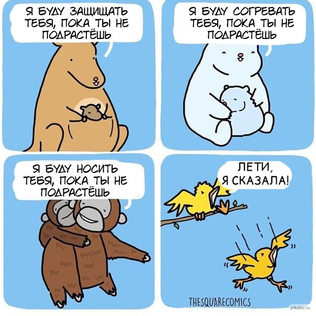 Привет, дорогой друг! Если что и способно поднять настроение (даже если оно провалилось ниже некуда), то это милые #животные . Вообще, мне кажется, среди антистрессовых штучек пушистые и милые звери представляют нечто вроде тяжелой артиллерии, которая без труда сметет всю грусть с лица. Сегодня я решил пустить в ход такую тяжелую артиллерию, добавив к милым зверькам #юмор . Возможно, ты уже догадался, что именно животному миру будут посвящены сегодняшние #комиксы . Начнем с комикса от автора Alvin Juano, который выпускает серию веб-комиксов The Square Comics. Он заметил, что большая часть млекопитающих окружает своих детенышей заботой и вниманием, в отличие от птиц, предпочитающих сразу приучать птенцов к суровой правде жизни. Честно говоря, я не силен в эволюционных теориях, поэтому даже не задумывался о том, что человек по своей сути является хищником. Это было до того, как я увидел следующий комикс от автора Jake likes onions. Отмечу, что в отличие от животных, человек представляет