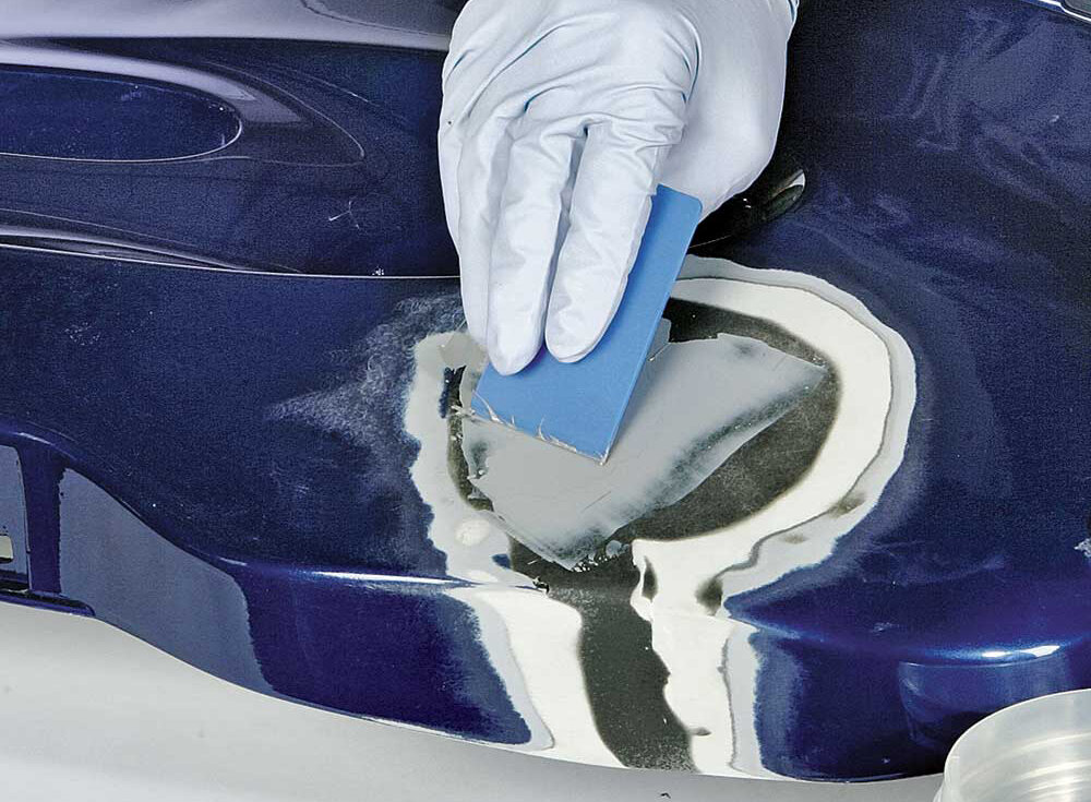 Шпатлевка - многосоставной материал, включающий в состав полиэфирные смолы и тальк. Смола отвечает за адгезию, тальк придает составу мягкость, способствуя удобству нанесения. Роль растворителя в массе шпатлевки играет стирол, который испаряется по мере отверждения смеси.