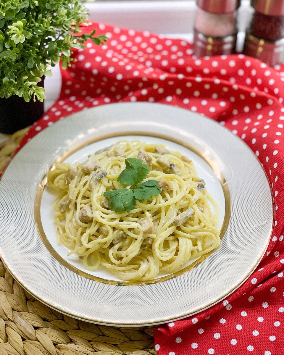 Ингредиенты: -куриное филе( 800 г) -лук(2 шт) -шампиньоны(400 г) -спагетти(450 г) -сливки(350 г) -растительное масло -соль/перец(по вкусу) 1.Куриное филе нарезаем небольшими кусочками. 2.Выкладываем курицу в сковороду и обжариваем на растительном масле.Солим/перчим. 3.Пока обжаривается филе,мелко нарезаем лук и отправляем его в сковороду к курице.Обжариваем до прозрачного состояния. 4.Параллельно начинаем варить спагетти. 5.Промываем шампиньоны и нарезаем их пластинами. 6.Отправялем грибы в сковороду,перемешиваем и жарим до зарумянивания и выпаривания из них жидкости. 7.Вливаем к курице с грибами сливки, перемешиваем.И теперь это все нужно потомить на медленном огне 5 мин. 8.Отправляем в сковороду спагетти, перемешиваем и тушим вместе еще 5 мин. БЛЮДО ГОТОВО! Посыпаем пасту тертым пармезаном и наслаждаемся🧀Приятного аппетита!🥘😋