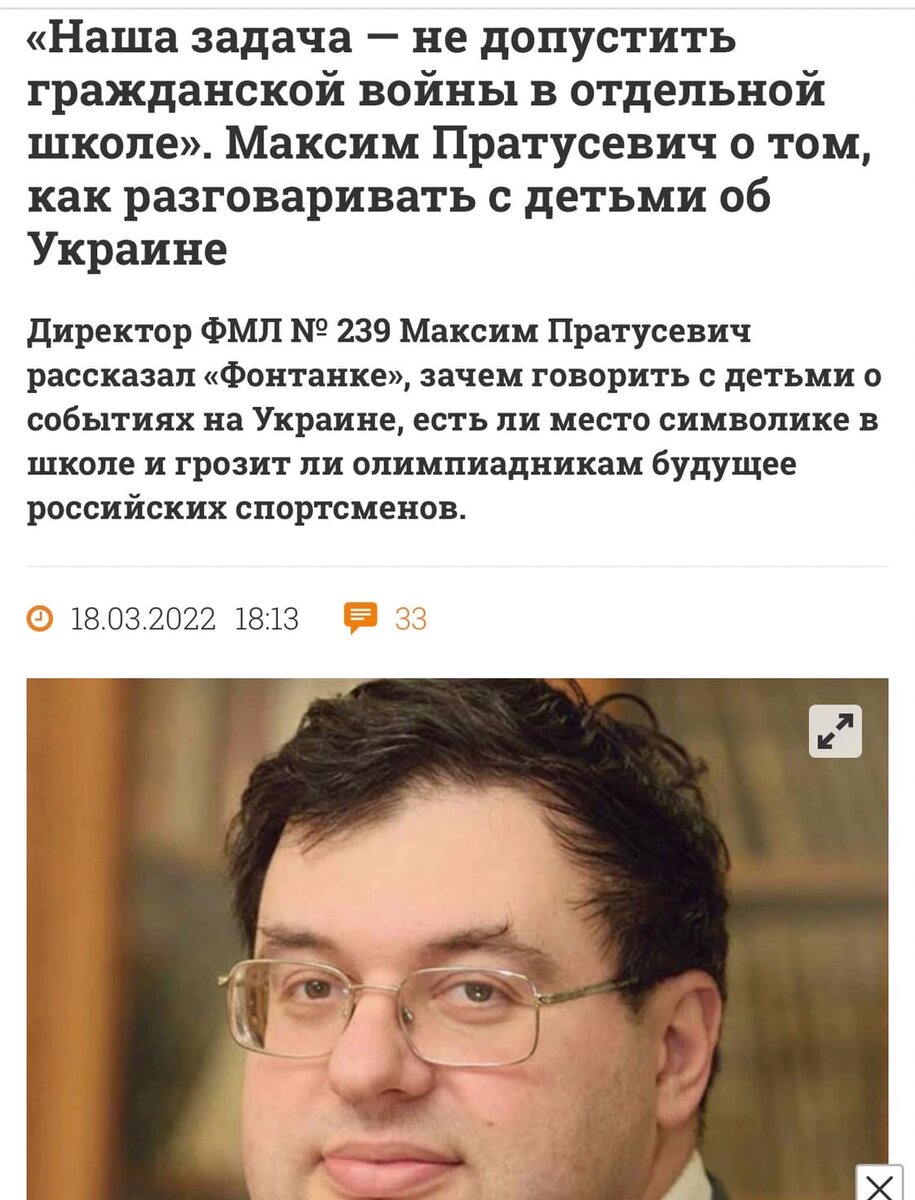 ...Тут один деятель, между прочим, директор элитной гимназии, вернее даже "Президентского лицея", некто Максим Пратусевич пытается "пробежать между струек", то есть учить детей предмету, на отвлекаясь на Добро и Зло. На такую "сущую ерунду", как ,"что такое хорошо и что такое плохо". В его лицее вы не увидите символики "Z". Он этого не допустит. Директор "выше всего этого". Впрочем, он и не в восторге от украинского флага. Потому, что он, якобы, "не хочет гражданской войны в школе". Это цитата.