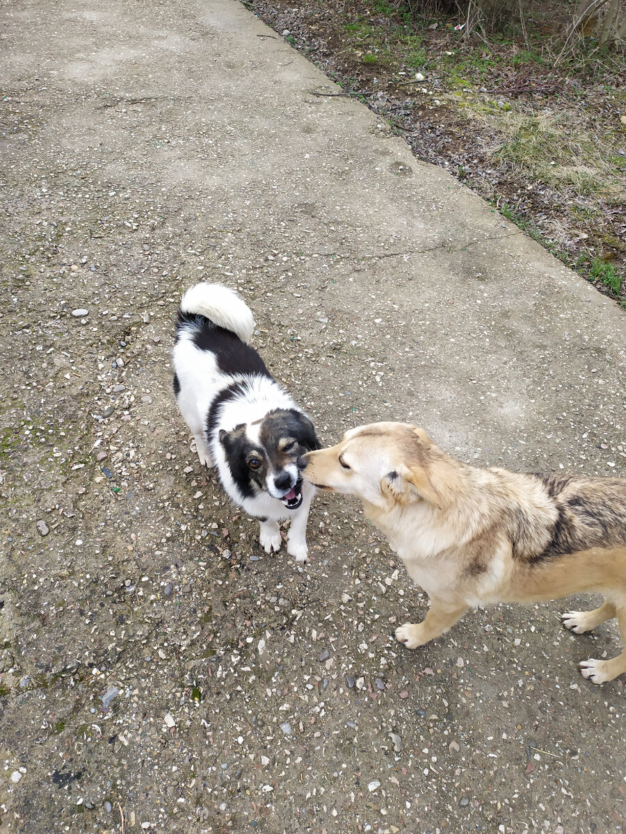 Друзья, приветствую вас! Как вы относитесь к бездомным собакам? В нашем посёлке, как и во многих других, есть бездомные собаки. У каждой стаи своя территория. Недалеко от нашего дома есть магазин, во дворе которого живут дворняги. Их подкармливают неравнодушные прохожие. Две собаки стерилизованные с бирками на ушах, а одна собачка, совсем маленькая, появилась недавно, после нового года. Вот этот чёрно-белый пёсель. Он самый маленький из трёх собак. И если приносишь им вкусняшку, то этому малышу ничего не достаётся, всё забирают собаки побольше. А рыжая - липучка невозможная. Вобщем, мы их периодически подкармливаем тем, что остаётся со стола. Поэтому, увидев нас, собаки весело машут хвостами. Выхожу я недавно из магазина и слышу мужской голос: "Из-за ваших собак дети в школу ходить боятся! " Интересно! Поворачиваюсь и спрашиваю: "Почему Вы решили, что это мои собаки? " Мужчина смутился. - А, что не ваши? - Нет, не мои. - Ну, просто они так Вам обрадовались. Извините! Больше