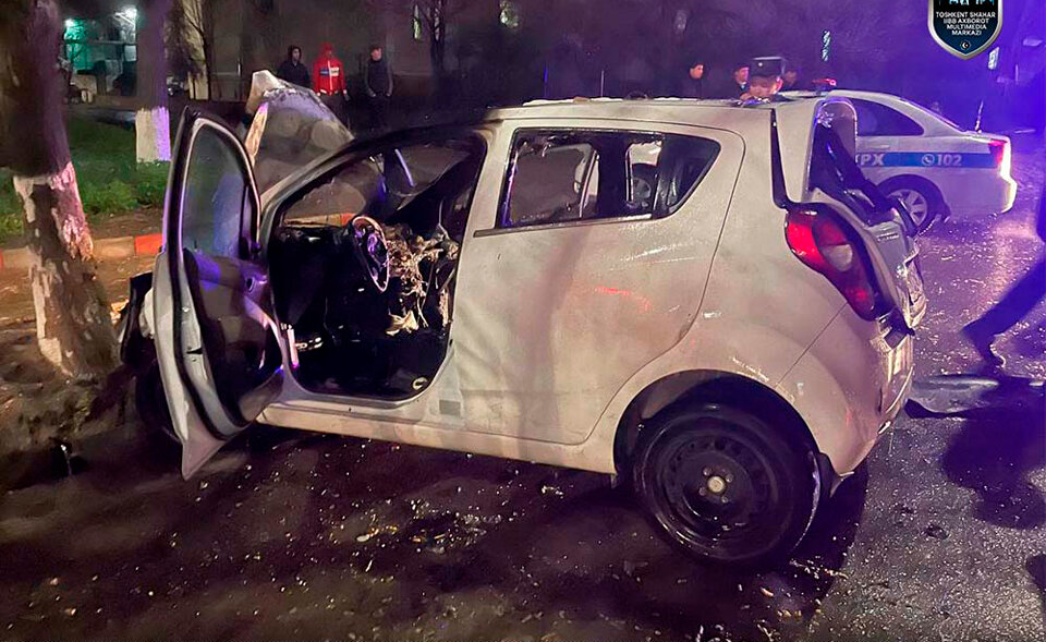В Ташкенте "Спарк" врезался в дерево и загорелся. Очевидцы успели вытащить людей из авто до возгорания