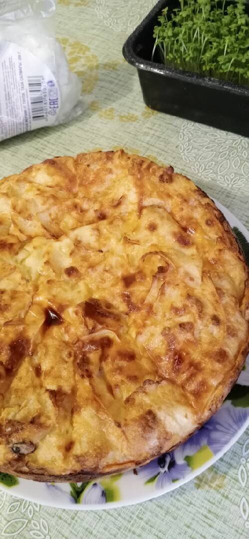 Выпечка из разряда ПП. Вкусно, быстро и не дорого) Ингредиенты: лаваша тонкого, яйца, творога 5%, кефир 2.5%, Сыр, Соль, Сухой чеснок, Растительное масло Способ приготовления: Лаваш нарезать или нарвать небольшими кусочками. В отдельной миске смешать: творог, яйцо, кефир, сыр натертый, соль и сушеный чеснок можно свежим заменить. По желанию зелень тоже можно положить. Все перемешать. Выложить лаваш в творожно-кефирную смесь. Перемешать. Форму сбрызнуть раст маслом и выложить смесь. Выпекать 25-35 минут при 180 гр. Приятного аппетита.