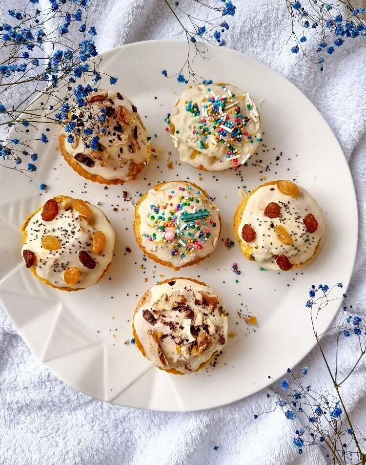 Расчитан на 1 кулич или 5 кексиков Ингредиенты: яйцо, творога(брикетным), Сах.зам, слив масла (или 2ст.л растопленного), муки овсянной, ч.л развыхлителя, гр мака, гр кокосовой пасты (можно арахисовой), изюма, ч.л кукрумы (добавляю для цвета, не обязательно), соли, для контраста, Гоголь моголь, ст.л сухого молока, ст.л молока обычного, Посыпка, Орешки, изюм, мак,посяпка купленная Способ приготовления: Мак и изюм залить кипятком и отставить в сторонку Взбиваем яйца до пены и добавляем все остальное Слить жидкость с изюма и мака, добавить в тесто Ставим в духовку (если ввиде кексом делаете то на 25- 30 мин, если кулич один то на 30-40 минут) Гоголь моголь: смешать ложкой все,если сильно густо,то добавить молока Готово