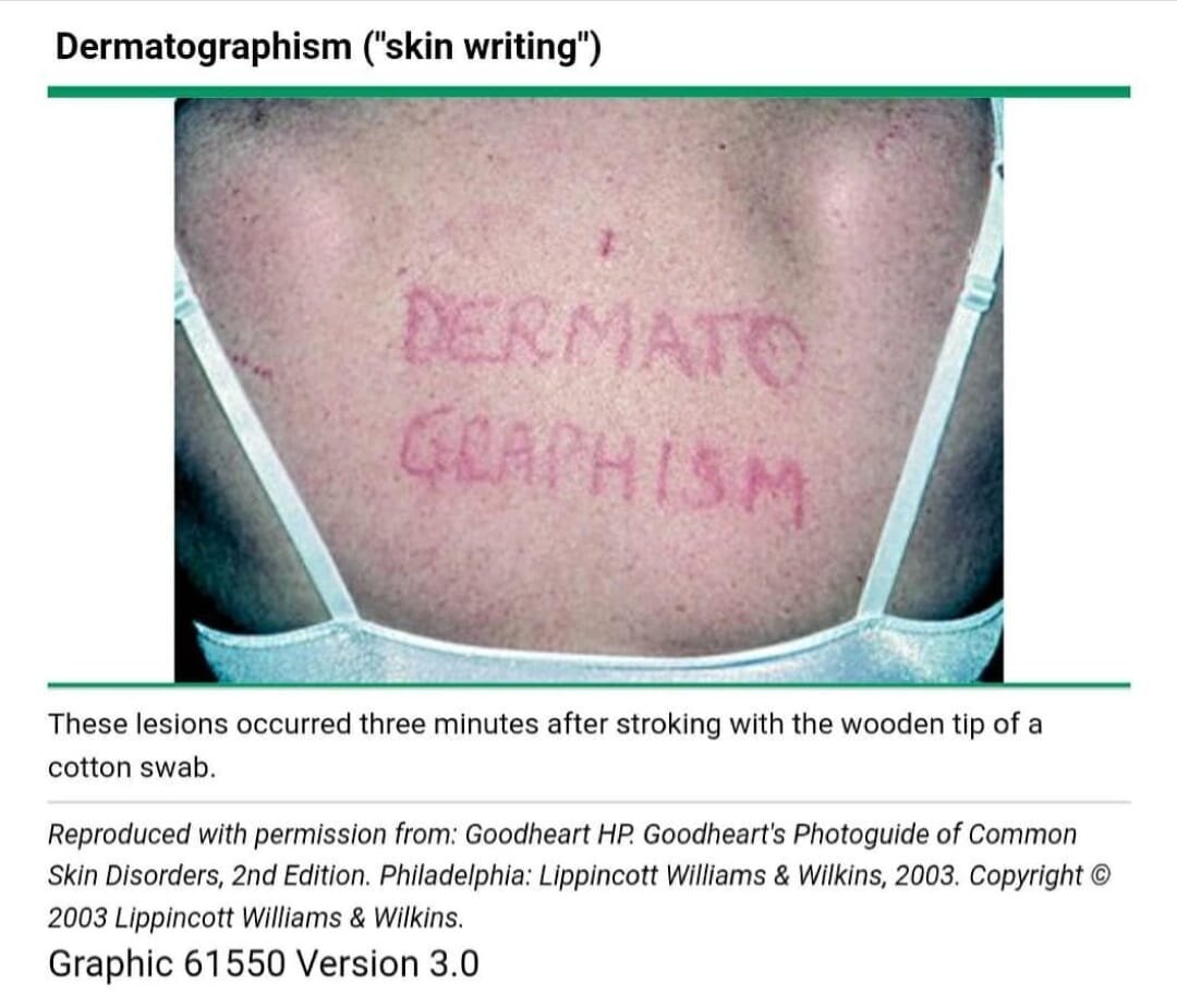 Часто вы рисуете на коже рисунки? Дермографизм (дерматографическая крапивница — ДК) буквально означает «писать на коже». У пациентов с ДК появляются уртикарные высыпания после сильного воздействия, например расчесывания или давления на кожу. Дермографизм является наиболее распространенной формой индуцированной крапивницы, и часто является случайной находкой. Существует несколько форм дермографизма. _Простой дермографизм (ПД). ПД является более распространенным состоянием, при котором на коже образуются уртикарные элементы в течение 6-7 минут после расчесывания или другого воздействия на кожу, при этом кожный процесс не сопровождается зудом. Кожный процесс регрессирует в течение 15-30 минут. _Симптоматический дермографизм (СД) встречается реже. При СД кожный процесс сопровождается зудом. Высыпания появляются в течение первых 5 минут после травматизации кожи. Кожный процесс сохраняется в течение 30 минут. ПД встречается в общей популяции примерно 2-5 %. СД встречаются