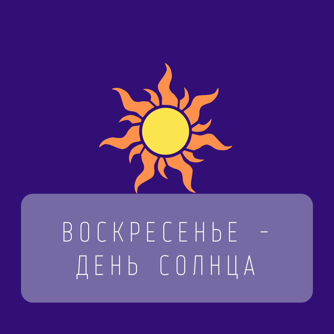 Солнце — это источник жизни для нас, главный объект Солнечной системы. Во многих странах воскресенье считается началом недели. Ключевые слова – дух, сознание, жизнь, творчество, любовь, дети, праздник, игра, яркость, щедрость. Солнце — это проявление благостной мужской энергии во всей своей красе. Считается, что для того, чтобы в жизни была радость, нужно учиться отдавать — ведь Солнце светит для всех бескорыстно. Рекомендации Солнца на воскресенье: -встать до восхода и встретить рассвет. Ранний подъём, до восхода, зарядит солнечной энергией человека на всю неделю. -хорошо пообедать в полдень, употребляйте больше солнечных продуктов: лавр, злаки, зелень, семечки, орехи, ягоды, чай из ромашки, шафран, корица, имбирь. -наденьте золотые украшения, чтобы получить защиту и поддержку Солнца. Золото — земное проявление Солнца — самый творческий, праздничный и щедрый металл. -в течение дня желать счастья всем живым существам, быть щедрым. -общаться с отцом (родовые практики по проработке эти