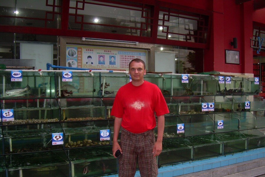Все как всегда произошло быстро, почти молниеносно. Уже куплены билеты на тропический остров Хайнань который расположен на юге Китая, на одной широте с Гавайями, из-за чего часто называется «Восточными Гавайями». На фото вы видите центральный вход в ресторан. В больших ваннах живые морские гады. Можно пальцем ткнуть и тебе его приготовят. Важный нюанс, цены понятно в юанях, за полкило живого(сырого) веса.