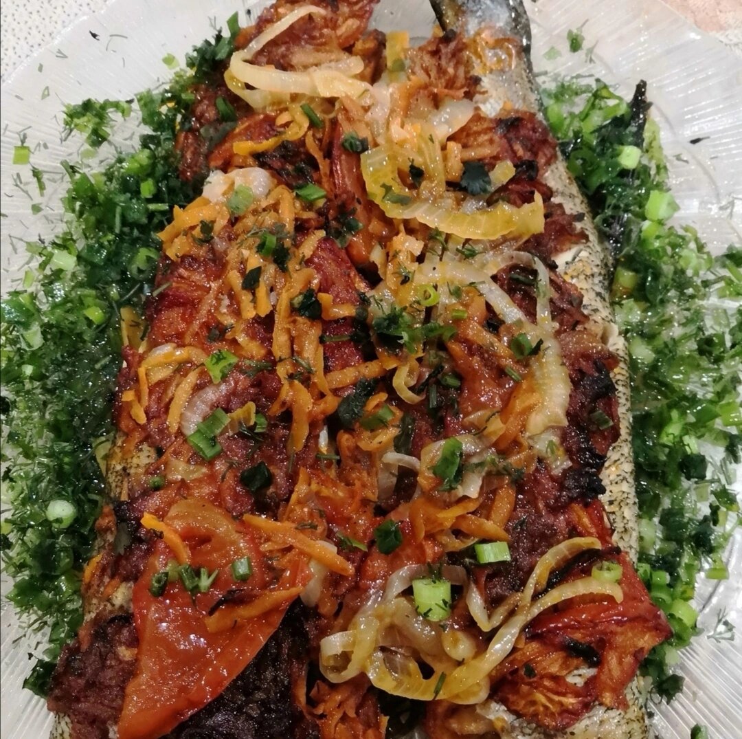 Всем привет 👋 Сегодня хочу поделиться с Вами рецептом очень вкусного и сытного блюда - донская щука с помидорами и острой морковью. ⠀ Щука, запечённая в духовке - рецепт для тех, кто не знает, как приготовить щуку. Блюдо получается сочным, с остринкой и приятным послевкусием! ⠀ И так, нам понадобится: 1. Щука - 2 шт. 2. Морковь - 2 шт. 3. Лук - 2 шт. 4. Помидор - 2 шт. 5. Острый перец - 1 шт. 6. Чеснок - 3 средних зубчика. 7. Лавровый лист - 2 шт. 8. Соль и перец по вкусу 👍 ⠀ Способ приготовления: ⠀ 1. Обжариваем в масле чеснок, острый перец (порезанный небольшими кусочками) и лавровый лист - 2 минуты. После обжарки достаём ингредиенты. ⠀ 2. В это масло, где жарились предыдущие ингредиенты высыпаем мелко нарезанный лук и натертую на средней тёрке морковь и обжариваем до золотистого цвета, затем добавляем порезанные полукольцами помидоры и ещё обжариваем 7-10 минут. ⠀ 3. Очищенную и раздедвнную рыбу кладём на обмазанный подсолнечным маслом протвинь. ⠀ 4. Сверху и во внутрь рыбы выкла
