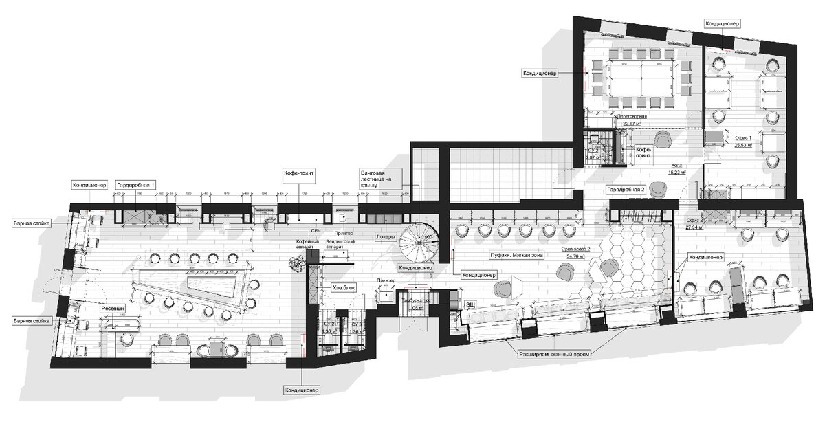 Если бы этот проект был человеком, это был бы однозначно подросток. Несуразный парень: длинное, узкое помещение с низкими потолками. Мы назвали его Константин Игнатьевич Ворк, сокращено "КоВорк". Работа по этому проекту осложнялась большим количеством согласующих. Как если бы у Кости было много бабушек и тёть, которые принимали активное участие в его воспитании…бедный Костик 😬 Основная зона помещения - open space. Такое конструктивное решение стало возможно благодаря устройству проемов и усилением несущих стен. В проекте предусмотрены специальные зоны: переговорные, медиа центр, офис-трансформер. Звукоизоляционные ниши предусмотрены для оперативных телефонных разговоров. Разносторонний получился парень. Вишенка на торте - акцентная винтовая лестница «в небеса», не то что бы заказчики были фанатами Led Zeppelin, просто у посетителей появилась возможность выходить на крышу. Цветовое решение было принято на основе бренд бука и исходя из личного выбора заказчика 🙌🏻 Школьную форм