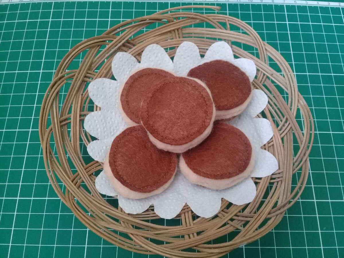 Приветствую всех! Продолжаем серию мастер-классов по пошиву еды и продуктов питания из фетра. Сегодня расскажу о том, как сшить игрушечные оладьи, в англоязычных странах их называются панкейками. Итак, приступим! Вам понадобиться: - фетр коричневый и бежевый, - нитки коричневые и белые, - синтепон, - игла или швейная машинка, - ножницы - карандаш, - выкройки. Шаг 1. Подготовим выкройки. Для того чтобы сшить оладушки, нам будут нужны два круга, первый диаметром 4 см, второй – 5,5 см. Размер можете регулировать на свое усмотрение. Главное, чтобы один круг был больше другого примерно на 1,5 см. Шаг 2. Вырезаем детали оладий по выкройкам. Для одного оладушка необходимо вырезать два маленьких круга и два больших. Маленькие круги вырезаем из коричневого фетра, а большие – из бежевого. Шаг 3. Приступаем к сшиванию деталей. Маленький круг размещаем сверху на большом по центру и пришиваем на швейной машине или вручную. Не забудьте, нитки должны быть подобраны по цвету. Оставшиеся концы нитей за