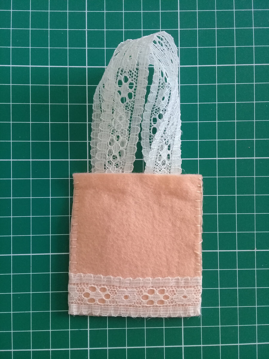 Всем привет! Давайте из фетра и других материалов сошьем сумку-шопер для уточки Lalafanfan. Я сделала два варианта, в этой статье расскажу, как сшила первый – его я назвала «Весенне-воздушный». Вам понадобиться: - фетр персикового цвета, - кружева, - белые нитки, - нитки-мулине бежевые, - игла, - ножницы, - карандаш, - выкройка. Шаг 1. Подготовим выкройку. Для сумки-шопера я использовала в качестве выкройки прямоугольник размером 7,5х7 см. Шаг 2. Вырезаем детали сумки по выкройкам. Для пошива одной сумки нужно вырезать два прямоугольника по выкройке из фетра персикового цвета. Кроме деталей из фетра, нам понадобятся три отреза кружевной ленты примерно одинаковой длины - для ручек и декорирования сумки. Шаг 3. У меня фетр жесткий, сшить детали с изнаночной стороны и вывернуть не получится. Поэтому я сшивала детали с лицевой стороны красивым аккуратным швом. Узелок спрятала внутри сумки, между деталями. Шаг 4. После того как сшили две основные детали сумки, украсим низ кружевной лентой.