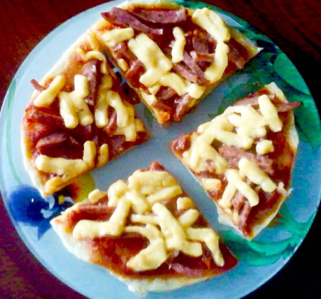 😋😋😋 Ингредиенты: муки, растительного масла, по вкусу соль, чайная ложка сухих дрожжей, вода сколько возьмёт тесто, копчённой колбасы, голландского сыра, чесночного кетчупа Способ приготовления: Дрожжи разводим тёплой водой и оставляем на 5 минут. В миску добавляем соль, растительное масло и поднявшиеся дрожжи. Замешиваем тесто и оставляем на полчаса. Нарезаем колбасу и сыр соломкой. Раскатываем тесто тонко и выпекаем на сухой сковороде с обеих сторон минут 8. Смазываем корж чесночным кетчупом, посыпаем сверху колбасой и сыром. И опять ставим на 5 минут под закрытой крышкой.