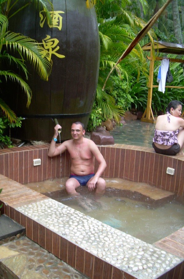 А не принять ли нам ванну из чая или например с кокосовым молоком? Мы так подумали и поехали на горячие термальные источники Наньтянь которые находятся в 30 км от города Санья. Это оздоровительный комплекс под открытым небом, который включает в себя 36 бассейнов с термальной водой различной температуры, большой плавательный бассейн, детский бассейн с горками. Все бассейны расположены в тени тропического сада. Бассейны все разные-есть с кофе или чаем, есть с кокосом, с пивом, с лепестками роз, все с теплой водой, но разной теспературы. Купание в источнике снимает стресс, благотворно влияет на кожу и суставы, и помогает в лечении многих заболеваний.