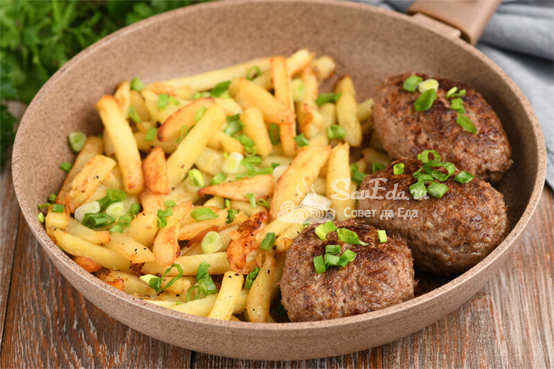 Это блюдо всегда выручает, если надо быстро приготовить сытный обед или ужин. Готовится оно очень легко и много грязной посуды после приготовления не будет. Готовлю все на одной сковороде. И картофель, и котлеты получаются очень вкусными, ароматными, аппетитными и сытными. Блюдо жареное и довольно жирное, поэтому его всегда подаю с легким салатом из свежих овощей. Порции 3 Время подготовки 15 минут Время приготовления 25-30 минут Ингредиенты Инструкции 1. Картофель очищаем, нарезаем брусочками и, чтобы убрать крахмал, промываем 3-4 раза. 2. Откидываем на дуршлаг. Промытые брусочки картофеля при жарке не будут прилипать друг к другу. 3. В миску отправляем фарш, добавляем соль, перец, измельченный на крупной терке лук и панировочные сухари. Фарш можно использовать любой по вкусу (у меня свинина и говядина). 4. Фарш перемешиваем, берем его в ладонь и ударяем о дно миски. Делаем это 2-3 раза (отбиваем фарш). 5. В сковороде разогреваем масло. Формуем из фарша продолговатые котлеты и выклад