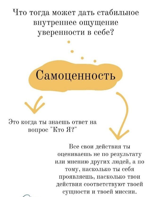 Полное принятие себя, ощущение уверенности, свободы, цельности, - важны для каждого человека. Когда ты обретаешь самоценность, мир будто бы протягивает к тебе руки и крепко обнимает, одаряя всеми благами. Уверенные люди всегда достигают высот, потому что они постоянно активны, когда многие люди выбирают бездействие из-за тараканов в голове. Из-за собственных сравнений и навязанных слов другими людьми, мы способны потерять любовь к себе. Но никогда не поздно заново все построить, главное - осознать проблему. Где осознание, там и решение. В чем заключается уверенность в себе? Есть 4 сферы жизни укрепив которые, ты станешь увереннее и будешь чувствовать себя лучше. Деятельность Любимое дело, деньги, карьера, статус, признание, твои достижения, успех. Тебе должно обязательно нравится то, чему ты посвящаешь своё время. Тело Привлекательность, стиль, здоровье, физические удовольствия, сила, одежда, выносливость, спорт. У тебя есть только одно тело, это твой дом на всю жизнь, береги ег