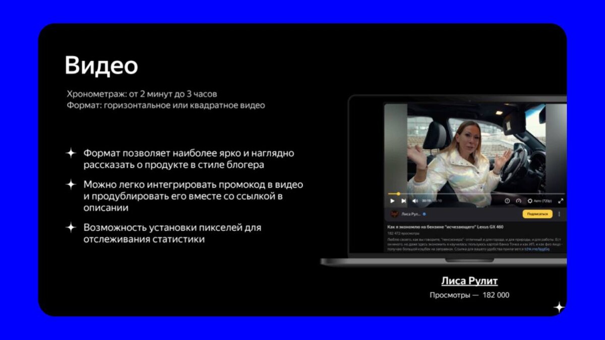 5 ФОРМАТОВ КОНТЕНТА: Видео | Ролик | Пост | Статья | Трансляция Сегодня разберем формат: видео Хронометраж: от 2 минут до 3 часов Формат: горизонтальное или квадратное видео Преимущества: • Формат позволяет наиболее ярко и наглядно рассказать о продукте в стиле блогера. • Можно легко интегрировать промокод в видео и продублировать его вместе со ссылкой в описании. • Возможность установки пикселей для отслеживания статистики 🔥 Пример: https://zen.yandex.ru/video/watch/61af978c42eb935856037d4a?from=channel