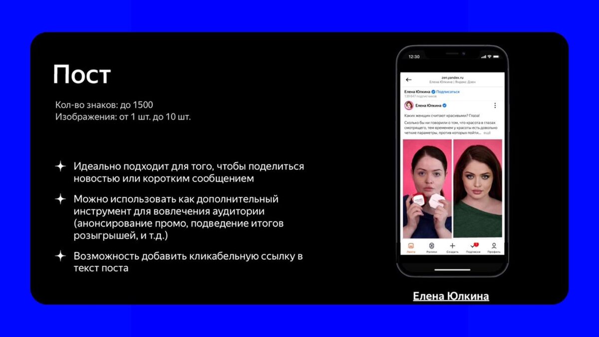 5 ФОРМАТОВ КОНТЕНТА: Видео | Ролик | Пост | Статья | Трансляция Сегодня разберём: пост Кол-во знаков: до 1 500 Изображения: до 10 шт. Преимущества: • Идеально подходит для того, чтобы поделиться новостью или коротким сообщением • Можно использовать как дополнительный инструмент для вовлечения аудитории (анонсирование промо, подведение итогов розыгрышей, и т.д.) • Возможность добавить кликабельную ссылку в текст поста Пример: https://zen.yandex.ru/media/elenayulkina/kakih-jenscin-schitaiut-krasivymi-glaza-skolko-by-ni-govorili-o-tom-chto-621f3864705b422297b17537