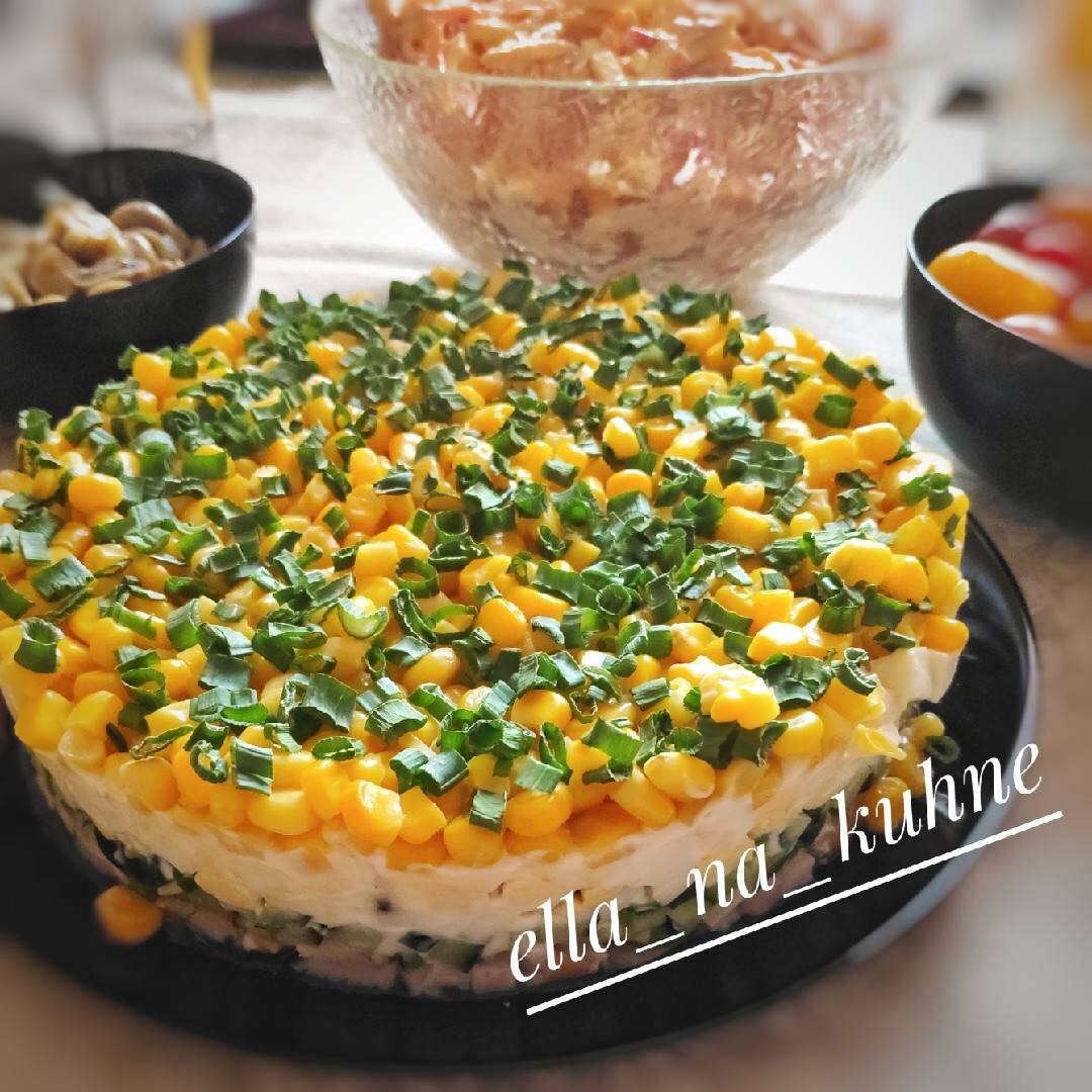 Очень сытный и простой в исполнении салат. Не обязательно делать слоями, но я люблю, когда красиво. За идею спасибо Светлане Спиридова @Sveta_Spir ❤. #меню Ингредиенты: копчёной куриной грудки, средних огурца, яиц, консервированной кукурузы, Зелёный лук, Майонез Способ приготовления: Приготовить всё ингредиенты: нарезать кубиками куриное мясо, огурцы, яйца. Кукурузу открыть и слить воду. Зелень мелко нарезать. На плоскую тарелку поставить кольцо и начать формировать салат слоями: мясо, майонез, зелень, огурцы, майонез, яйца. Яйца покрываем майонезом, сверху кукурузу и присыпать зеленью. Поставить на часок в холодильник. Перед подачей убрать кулинарное кольцо. Приятного аппетита😍! Если вам по душе мои незатейливые рецепты: подписывайтесь и оставляйте свои фотоотзывы📸!