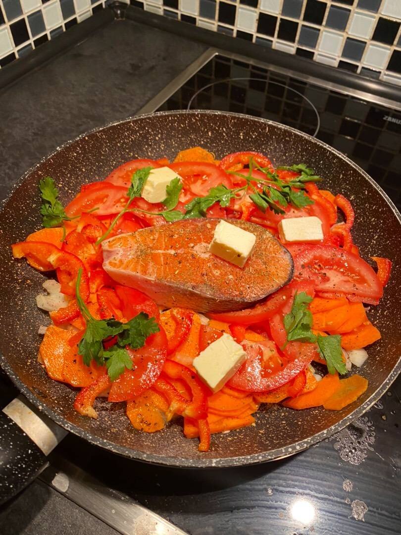 Вкусное и полезное блюдо Ингредиенты: Лосось , Лук, Морковь, Красный перец, Помидор, Растительное масло, Сливочное масло, Петрушка или кинза, Соль, перец, специи Способ приготовления: Замариновать стейки - щедро посыпать солью, немного перца и специй по вкусу. Нарезать лук средними полукольцами, помидоры полукольцами, морковку тонкими колечками, перец соломкой. На сковороду наливаем подсолнечное масло, кладём лук, сверху морковь и солим, сверху сладкий перец, затем помидоры. Снова солим и кладём стейки. Добавляем сливочное масло на овощи и стейки, накрываем крышкой и тушим 10-15 мин (зависит от толщины стейка) на среднем огне. Я переворачиваю стейки в середине жарки, но этого можно не делать,