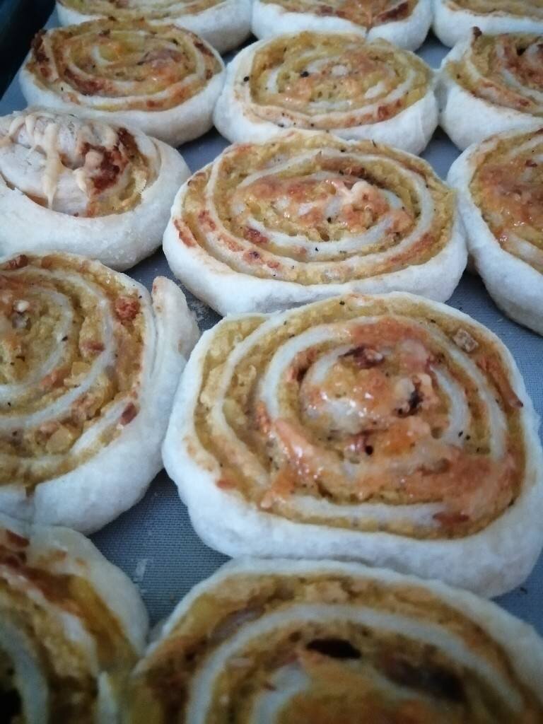 Ингредиенты: Слоёное тесто, Картофель, Лук, Чеснок, Соль, перец , Сыр Способ приготовления: Картофель почистить и отварить до готовности. Затем приготовить из него пюре, посолить, поперчить, добавить обжаренный лук и перемешать. Тесто раскатать и распределить пюре по всей поверхности, сверху выложить измельчённый чеснок. Свернуть пласт в рулет и нарезать его. Выкладываем получившиеся завитушки на противень, сверху слегка посыпаем тёртым сыром. Выпекаем в духовке примерно 20 минут при 180 град.