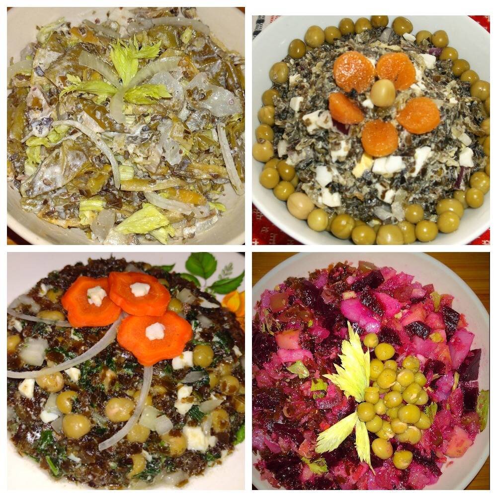 #меню Сделала заготовку из аптечной морской капусты,теперь делаю салаты из того, что есть в холодильнике и добавляю морскую капусту в них. Замариновала селедку и кильку, но с уксусом мне не понравилось, в салат стала добавлять, в винегрет. Все, что есть в печи, все на стол мечи. Ингредиенты: Вареные свекла, морковь, топинамбур, стручковая фасоль, бобовая фасоль, Маринованные огурцы, селедка и килька, лук репчатый, квашеная капуста, зеленый горошек, фасоль консервированная, сельдерея, вареные яйца, лук репчатый и зеленый, зелень, перец, соль , растительное масло или майонез для заправки, морской капусты из заготовки Способ приготовления: 1) Салат из топинамбура отваренного, стручковой фасоли, маринованного лука, сельди маринованной с уксусом, стебля сельдерея и морская капуста, майонез. Лук можно просто репчатый. Топинамбур намыть, очистить, нарезать кубиками и отварить 7- 10 минут в соленой воде. Не разварить! Замороженные стручки фасоли положить на горячую сковородку с маслом, накрыть
