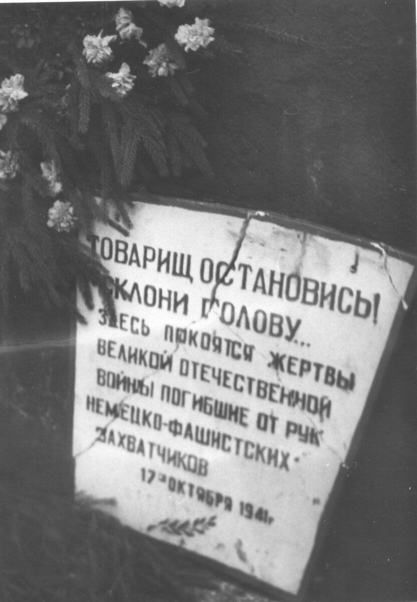 …Утро 7 октября 1941 года выдалось холодным и пасмурным. Охваченный ужасом, в окружении конвоиров, людской поток медленно двигался к урочищу Белый Ручей, Там, в чистом поле, в километре от академического пруда, уже были вырыты большие ямы, по пятьдесят метров в длину. Расстреливали из пулеметов, группу за группой – стариков, детей, мужчин, женщин...