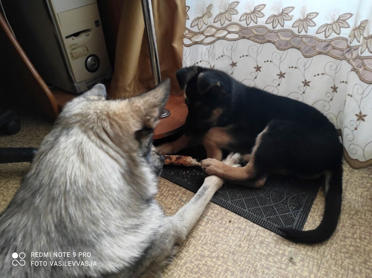 Вася, мой младший сын, заехал в гости со своим Риком, щенком немцем. Рада отреагировала нормально. Игра, никакой агрессии.