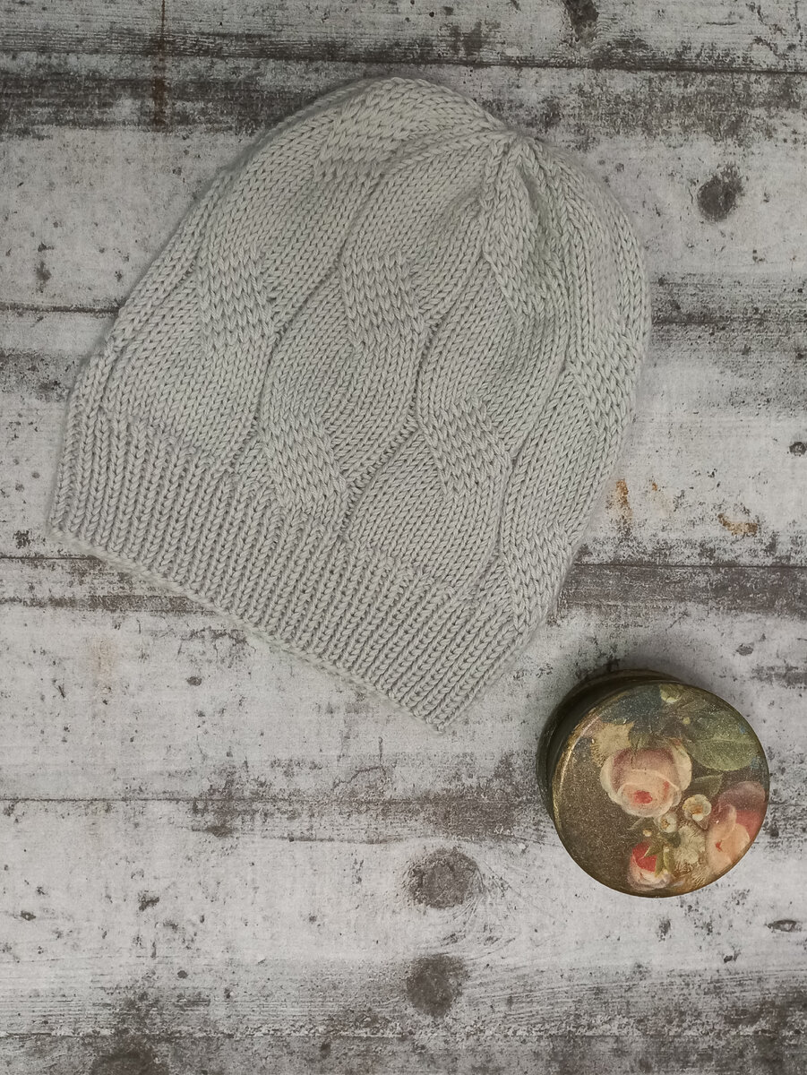 У этой шапочки очень красивый и простой узор.Справится любая рукодельница и очень оригинальная макушка. Я вязала свою шапочку на размер головы 52-55 см из 100% мериноса. У меня мериносик был тоненький поэтому я вязала в два сложения. На резиночке использовала спицы 3мм на основное полотно спицы 3,5 мм. Набрала 112 петель и провязала резиночку 1 на 16 см. Затем вязала по схеме расставляя ромбы в шахматном порядке. Формирование макушки начала когда у меня было провязано в высоту 21 см. Убавки в макушки делала так: 1 р.-изнаночные провязывала 2 вместе 2р-по рисунку 3р-делала убавки в начале и в конце лицевых полос и полос с ромбами. 4р-по рисунку 5р-убавки как в 3м 6р-по рисунку 7р-убавки как в 3м 8-по рисунку 9р-убавки как в 3м 10р-по рисунку 11р-как в 3м 12р-по рисунку 13р-провязать по 2вм лицевой в остатке 16 петель их я стянула иглой. Вот и всё.Моя шапочка готова.