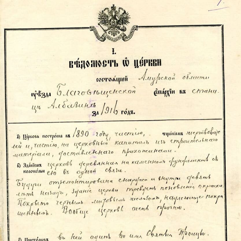 Сколько церквей в станице Албазинской? Этот вопрос меня занимал давно... Из ведомости 1916 г. о церкви станицы: построена в 1890 г. в честь Святой-Троицы тщением жертвователей и частию на церковный капитал, из материала, доставленного прихожанами. Здание с колокольнею, сама деревянная, на каменном фундаменте. В этом же документе: расположена в 600 вертах от г. Благовещенска. Ближайшие церкви: Сергиевская на ст. Рухлово в 80 верстах и Троицкая на ст. Талдан в 70 верстах. Приписаны к сей церкви две церкви и 5 часовен: одна в Албазине, другая в Джалинде. Часовни хуторов: Орловском, Бейтоновском, Перемыкинским и Бекетовском, и селении Старо-Воскресенском. На картах-схемах предшествующего этому документу периода, в верхней части Албазина обозначено место Свято-Троицкой церкви. О ней пишет в своих Путевых Записках казак Дмитрий Пешков, выезжая на коне Серко в Санкт-Петербург в 1890 году: не видно при въезде в Албазин. И упоминает, что заходил на могилы родителей, не объединяя посещение кладб