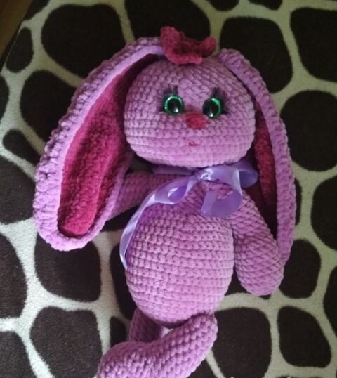 Зайчик очень мягкий и приятный на ощупь. в высоту получился 45 см (без ушек)