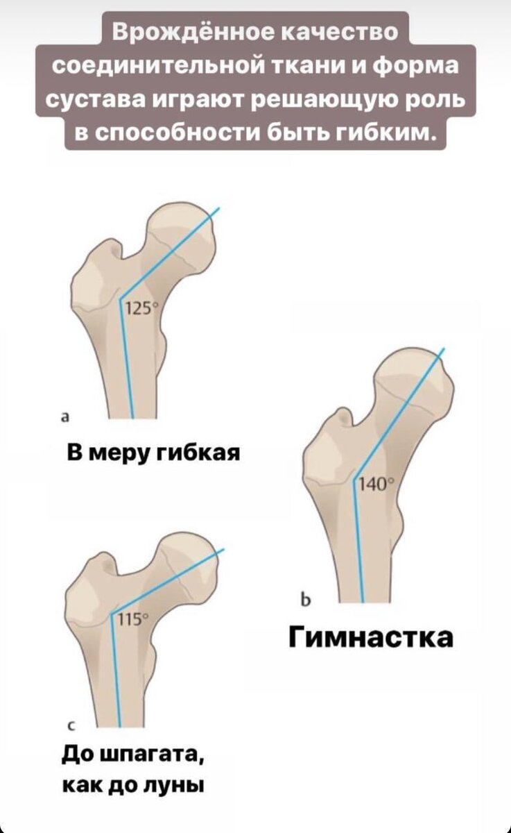 ☀️Сегодня хочу поговорить с Вами на тему гибкости. ❓Что для Вас значит гибкость? Что первое приходит на ум? Чаще всего люди представляют, как прекрасно гнутся пополам и садятся на шпагаты. Друзья, но гибкость совсем не подразумевает под собой такие сложные элементы. 🤸🏼Гибкость - это одно из пяти физических качеств человека, которое характеризуется подвижностью различных сегментов опорно-двигательного аппарата, мобильностью суставов, а также способностью выполнять движения с большей амплитудой. ✅В прошлом уроке, я давала Вам упражнение на развития подвижности ТБС ( тазобедренного сустава). Давайте на примере этого сегмента разберёмся. Например, вы пришли на урок по растяжке и перед Вами стоит красивая цель - сесть на шпагат. А что если я вам скажу, что в вашем случае это не возможно? *️⃣Посмотри на прикрепленную картинку. Она говорит о том , что не все способны сесть на шпагат, гнутся пополам и поверьте, в этом нет ничего плохого! 🔹С анатомической точки зрения, тело вам может не позв