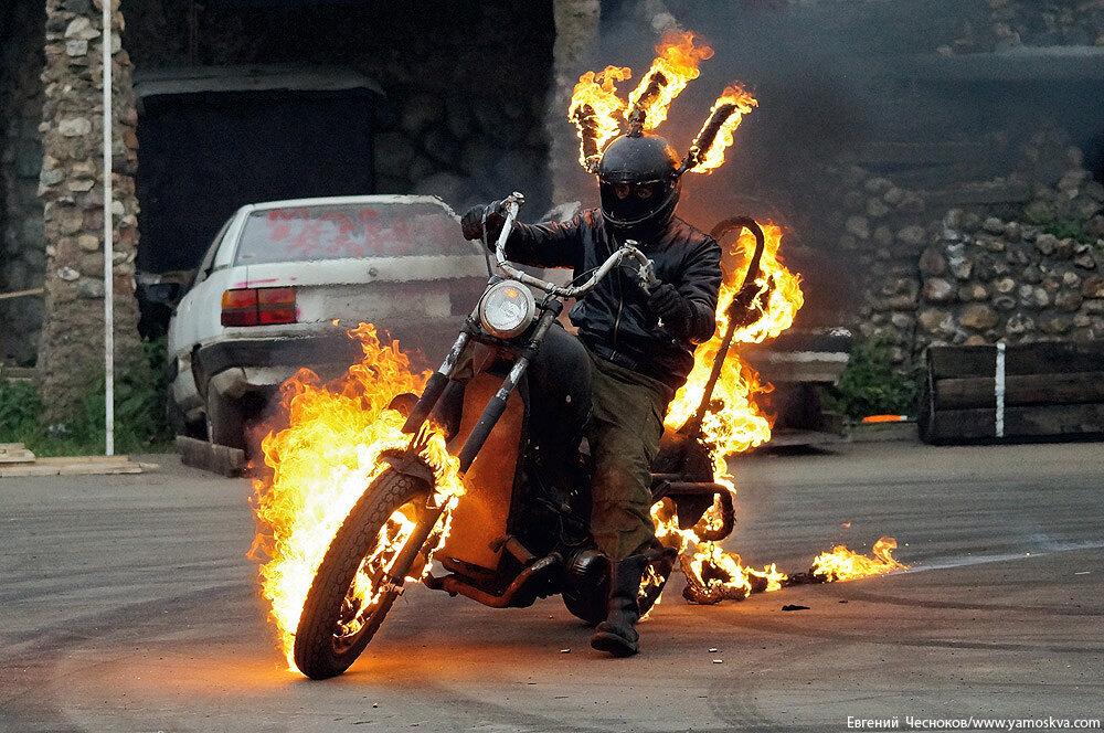 Без огня и фейерверков не обходится ни одно мероприятие каскадёров. Газовые горелки – фоги, – заряженные пропаном, поднимают столб огня высотой семь-восемь метров.
