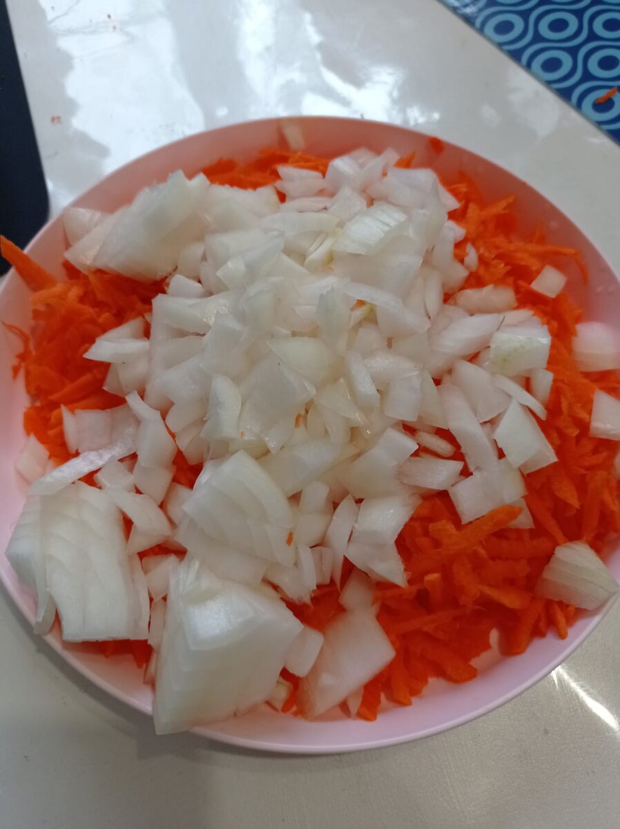 Всем доброго времени суток. Сегодня мы решили вам показать рецепт голубцов , но немножко с другим способом приготовления. Для приготовления нам понадобиться: 1. Фарш ( у нас индейка, а там как вам захочется) 400 г; 2. Рис 200 г; 3. Капуста 1 кг.; 4.Морковь 1 большая; 5. Лук 1 большой; 6. Сливки или сметана 400 мл; 7. Зелень (Укроп, петрушка); 8. Томатная паста 200 мл.; Начинаем готовить. Для начала моем морковь и чистим ее. Далее чистим лук . Морковь трем на купной терке. Лук режим мелкими квадратиками. В итоге у нас должно получиться как на фото. Далее перекладываем в нагретую с маслом сковороду и пассеруем около 20 минут, пока лук не станет прозрачным. После добавляем томатную пасту и тушим еще пару минут. Далее ставим рис вариться. Он должен получиться недоваренным. Я буду использовать рис быстрого приготовления в пакетиках. Ставим на 15 минут в мультиварку и начинаем подготавливать капусту. Снимаем верхний пару листом и ополаскиваем кочан. Далее вырезаем кочерыжку. Втыкаем вил