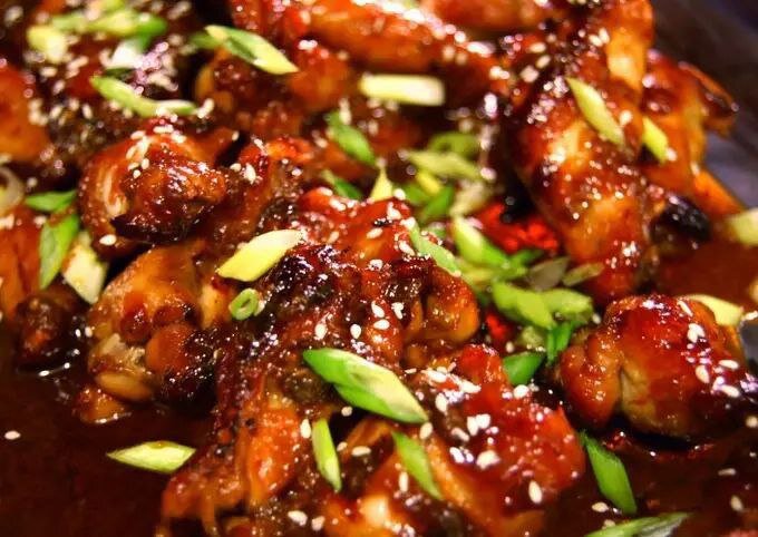 Курица за 15 минут Ингредиенты: Куриное филе — 300 г Мед натуральный — 40 мл Соевый соус — 50 мл Яблочный уксус — 2 ст. л. Имбирь молотый (порошок) — 0,5 ч. л. Чеснок — 2 зубчика Крахмал — 1 cт. л. Лук — 1 пучок Перец черный молотый — по вкусу Кунжут — по вкусу Растительное масло — 2 cт. л. Приготовление: 1. Подготовьте продукты. Вымойте куриное филе, обсушите, лишняя влага не нужна. Куриное филе порежьте небольшими кусочками или длинными полосками. 2. Очистить чеснок и порубить мелко. 3. Смешайте в глубокой посудине мед, соевый соус, рубленый чеснок, яблочный уксус, молотый имбирь, крахмал и черный перец молотый. 4. На двух столовых ложках масла обжарьте на большом огне кусочки куриного филе до золотистого цвета. 5. В конце жарки влейте тонкой струйкой смесь, постоянно помешивая, жарьте, пока кусочки мяса не покротся соусом со всех сторон. На это уйдет всего пара минут, а то и меньше, соус быстро становится густым. 6. Подавайте курицу с вареным рисом, овощами свежими или отва