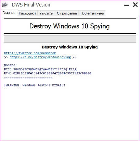 Тенденция развития последних операционных систем такова, что слежение за пользователями набирает гигантские обороты. В такой ситуации на помощь приходит приложение DWS Lite Windows 10. Телеметрия стала неотъемлемой частью ОС Windows. Помимо моральных неудобств пользователю, так же могут возникать проблемы с производительностью компьютера. Если ваш ПК слабый или жесткий диск работает медленно, то сбор различных сведений о ваших действиях и отправка их на сервер Microsoft могут приводить к дополнительному износу винчестера и периодическим зависанием программ. Отключить слежку можно при помощи программы «DWS Lite Final for Windows 10». Есть большое количество аналогов - различные AntiSpy и многое другое. Мы рассмотрим указанную выше утилиту. Как пользоваться DWS Windows 10 Давайте рассмотрим пошагово, как именно использовать эту программу. Главное окно приложения выглядит следующим образом. Шаг 1. Перейдите на вкладку «Настройки». Шаг 2. Кликните на пункт «Удалить Win 10 Metro приложения»